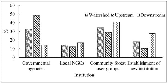 Different types of institutions were found actively involved in the area. The existing institutions with different working themes identified were community involvement committees, the boater’s committee, youth clubs, community forest users’ groups, the teacher-parents association, drinking water user’s committee, and financial cooperatives. Among the total respondents (n = 180), 34.4% of the respondents preferred community forest users’ groups, and 32.8% preferred governmental organizations such as the District Forest Office as a preferred institution for implementing PES mechanisms (Figure 2).