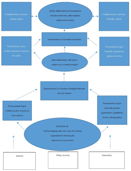 In analogy to the idealized description of “speaking truth to power” for the relationship between science and policy-making, one could speak of “providing aesthetics to power” for the relation of arts and policy-making. There is a long tradition of arts serving the powerful, be it kings, rulers, the church, or dictators. The aestheticization of ideologies in the service of the ruling classes follows—using the terminology of science–policy interface—a decisionistic model: political leaders set the goals, and artists fulfill an instrumental function through their aesthetic abilities. Even though studies on the aestheticization of (post)modern societies show that this traditional relationship still is of high and potentially increasing relevance [43], the arts–policy-making interface has changed dramatically since the beginnings of modernity and the progressing differentiation of social spheres and systems. As Luhmann has convincingly elaborated, an autopoetic social system of arts has emerged over the past three centuries [63]. Here, policy-making or science arts is considered to be a self-referential social subsystem with an autonomous operational modus for the (re-)production of art works. Its functional contribution lies in societal reflection, irritation, and providing contingency through its imaginative and fictional abilities. Under these circumstances, the relationship between arts and policy-making changes; besides the instrumental provision of aestheticization stands the (critical) artistic intervention into political contexts, especially in liberal democracies [64,65]. In all genres of arts, one can find ample examples for this politically challenging role of arts. The spectrum ranges from famous interventionist visual artists, such as Josef Beuys or Ai Weiwei, to political protest songs, up to fictional reflections of political issues in film or literature. Between the sketched extremes of the instrumental role of arts in service of the powerful on the one hand and critical interventionist arts on public policy on the other hand, one can find diverse forms of arts–policy interfaces as well. There are examples where artists are invited to intervene intentionally in political–administrative organizations or where the creative abilities of artists are looked for by political actors to help generate social and policy innovations [66]. However, the latter artistic policy practices, for which some analogy to the pragmatist scientific advisory model can be considered, are much less conceptually reflected and in practice institutionalized than the science–policy interface. It can be concluded here that the structural coupling of arts and policy-making is characterized by a variety of forms, but regarding collaborative—or pragmatist—artistic policy advice, the interface appears not as developed and institutionalized as it is the case with scientific policy advice. Moreover, there is no systematic approach connecting science and arts within (sustainability) policy contexts. Based on the observations and considerations made so far in this article on sensory sustainability science, scientific policy advice, and on arts and policy-making, a model for artful scientific policy advice is proposed to take advantage of the complementary abilities of science and arts in contributing to sustainability policy and governance in specific and sustainable development in general.