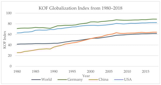 If we look at the KOF Globalization Index [24] and its development since the 1980s in Figure 1, we can see that the index has increased worldwide from 41.69 in 1980 to 61.82 in 2018. For Germany, for example, the index has risen from 71.22 to 88.83. Compared to China, where the index ranges from 25.66 to 64.28, and for the U.S.A. from 62.81 to 82.28, over a period of just under 40 years (1980 to 2018).