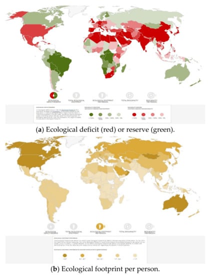 Figure 2 clearly shows that the industrialized and emerging countries, which have grown strongly with globalization in the last decades, also have the largest ecological footprint [26]. Both the ecological deficit (Figure 2a), which measures the difference between the ecological footprint and the biocapacity, and the ecological footprint per person (Figure 2b) are more pronounced in these countries (the ecological footprint is a measure of the productive area of land and water resources that, for example, an individual requires to compensate for its consumption activities. The ecological footprint used here is provided by York University Ecological Footprint Initiative [26] and distributed by the Global Footprint Network. Scientific literature on the ecological footprint include [40,41,42]).