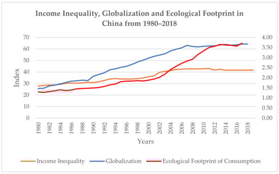 There are also numerous theoretical and empirical studies examining the relationship between inequality and globalization (among others [43,44,45,46,47,48,49,50]). Even if a positive correlation between globalization and inequality cannot be empirically proven for every country, globalization processes can be shown to have a certain influence on inequality [46,47,51]. The statistically measurable relationships depend, of course, on the used measures of globalization and inequality. Inequality, for example, is often measured by the GINI coefficient [52], which indicates how equally or unequal income is distributed in a society. To empirically support the argument of our paper—that a link between globalization, environmental degradation and inequality issues exists—let us take a small empirical look at the example of China (the data availability of the three variables globalization, ecological damage and inequality is often incomplete for historical periods. This distorts correlations for industrialized nations such as Germany and the U.S.A. in that they achieved a high degree of globalization early on (1970/1980s) but have invested increasingly stronger efforts in environmental protection since the 1970s. This creates an opposite effect on environmental damage. The ecological degradation, which would therefore have to be correlated with the early globalization phase of some countries, cannot be correlated with advanced measures such as the ecological footprint because of data availability. These measures often do reach far enough into the past. We therefore chose China for this small evidence check, which has made significant progress in globalization since the 1980s with an increase in KOF index value of 25.66 in 1980 to 64.28 in 2018).