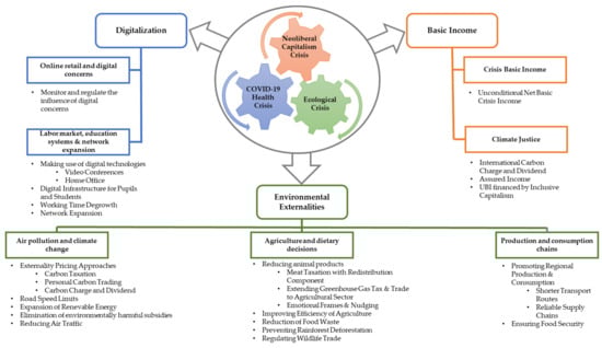 The rapidly spreading COVID-19 pandemic in 2020 not only brought many countries in the world to a state of health crisis, but also increasingly drove economic and social crisis. The roots of these crises, however, run far deeper and can be traced to decades of neoliberal political and economic actions and driving forces of globalization. Increasing globalization and liberalization of markets led to the increasing privatization of many public goods while collectivizing risks such as environmental disasters, pandemics and economic crises. This paper presents the context and emergence of these crisis states and derives public policy implications in the areas of externalities management, digitalization, and basic income based on a broad literature review. These key issues need to be addressed both during and after the crisis in order to address the problems of environmental quality and climate change mitigation, as well as rising inequality and injustice for current and future generations.