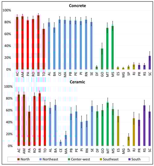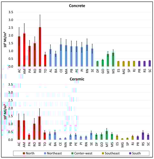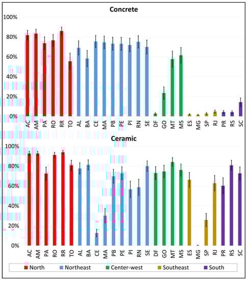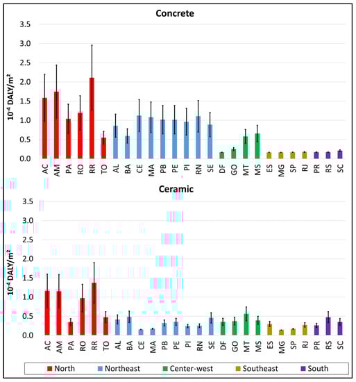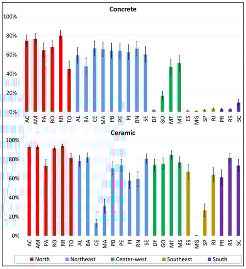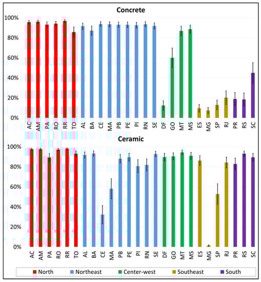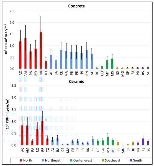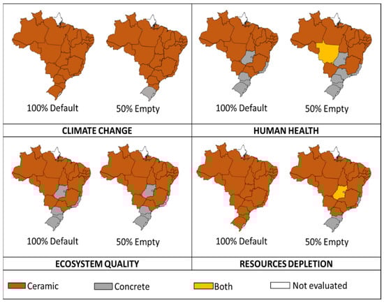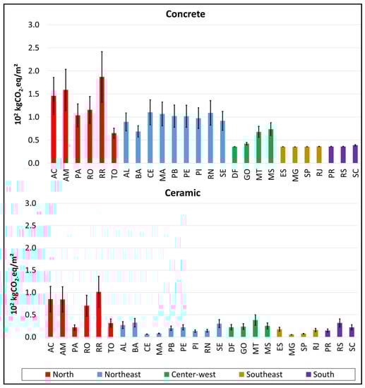 - Another item evaluated in this research is the contribution of the transportation stage concerning the total environmental impacts. The Northern region presented the highest percentage (reaching 98% for the concrete block walls and 99% for the ceramic block walls for the Ecosystem Quality impact in the least efficient scenario), while the Southeastern region had the lowest percentage (less than 1% for both materials) for the most efficient scenario in terms of the Climate Change impact.