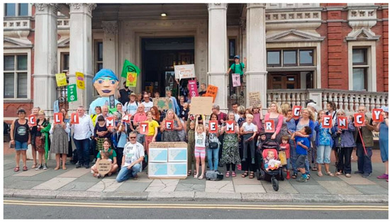 The day of 10 July 2019 was sunny and happy for Eastbourne eco activists. A sizeable crowd of us, with families and friends in tow and armed with placards, signs, posters, and a large puppet, gathered on the steps of the Town Hall to greet Councillors, on their way in to a Council Meeting, with our demand to declare a Climate Emergency. Having already met and campaigned together quite a few times over the preceding months—forming new groups, doing a cycle rally, participating in youth climate strikes, our Climate Café event, etc.—we all knew each other by then, and the overall mood and togetherness is captured well in a photograph taken on the day (Figure 1). To the extent that any further pressure was needed (most of the groundwork had been done in previous months; the protest outside was more symbolic, although still important), we succeeded: a climate emergency was indeed declared, and Eastbourne Borough Council (EBC) committed to Eastbourne becoming Carbon Neutral by 2030. Participants in the Council meeting reported that the decision was taken more or less unanimously, with both Conservative and Lib Dem Councillors agreeing. Setting the comparatively ambitious target of carbon neutrality by 2030, applying, importantly, not just to the Council’s own carbon footprint but to the town as a whole, felt like a real move in the right direction.
