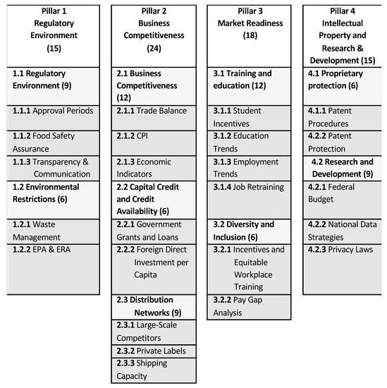 Each pillar is assigned a weighting, based on the number of sub-pillars and on the number of criteria within each sub-pillar (see Figure 1). For instance, Section 1 is worth 15 points, based on the three criteria in Section 1.1, each worth three points (3 × 3 = 9) and the two criteria in Section 1.2, also worth three points (3 × 2 = 6). The weighting across the pillars is largely reflective of the number of indicators in each pillar because each indicator has the same maximum number of points which can be awarded (3 points). The scores within a pillar help countries identify where their policies may have shortfalls compared to others based on scores but, as a whole, the index is skewed by the significant number of variables in Pillar 2, Business Competitiveness. External economics and the grocery industry, both of which are accounted for by the indicators in Pillar 2, do however play an important role in the food innovation environment. Future research may consider a re-weighting of the variables and also the pillars. In this paper, the identical maximum score of three points allowed for consistent data collection and analysis methods which are explained below.