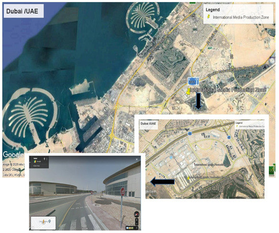 The main boulevard of the Dubai International Media Production Zone (IMPZ) is the case study canyon for this research. The media production city located in Dubai, UAE is a new development created in 2003 as a world-class ecosystem for media production, publishing, printing, and packaging. The city, which extends to 3.75 km2, and is still under construction, therefore, will be an opportunity to implement the findings of this study for optimizing the outdoor microclimate and thermal performance. The main boulevard is selected to study the impact of greenery on the microclimate parameters; the length of the case study boulevard is 480 m and the width is 80 m (Figure 1).