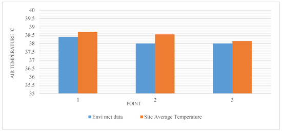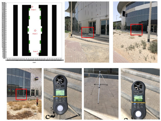 The model of the selected case study boulevard has been validated using ENVI-met simulation software. The data were collected from three points located at two measurement sets using the environmental meter EXTECH 45170. The instrument recorded high accuracy in measuring environmental and microclimate data; the accuracy in measuring the air temperature reaches ±3%. The air temperature was collected from 14:00 to 15:30 on 21 June 2021 from the three indicated points (Figure 2). The average data of two measurement sets were compared to the simulation results data of the same date and time. The validation results for the air temperature showed that the maximum variation reaches 0.55 (Table 2). Simulating the model and the comparison between the actual field measurement data and the simulation data proved the validity of the software as the variation is less than 0.05 [59] (Figure 3).