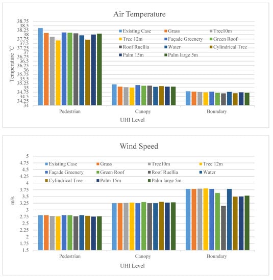 The simulation results showed that the impact of the greenery on the boulevard microclimate parameters are varied according to the UHI evaluated layer from one side and the type of vegetation applied from the other side. Simulating the developed scenarios of different greenery types showed significant variation in microclimate parameters, specifically, the air temperature reduction at the pedestrian level. At this level, the 12 m tree in the pedestrian pathway was the most effective vegetation in reducing the air temperature; the variation between this scenario and the reference case reaches 0.70 °C. This result was followed by another scenario of dense greenery type, the cylindrical tree, which recorded a variation in air temperature of 0.66 °C compared to the reference case. The 10 m trees have also an influence effect on reducing the air temperature by 0.5 °C, while using the water for cooling purposes reduced air temperature by 0.41 °C compared to the reference case. However, the green façade and green roof scenarios showed an approximated performance with a reduction of 0.27 °C and 0.3 °C, respectively, while the palm tree reduced the temperature by 0.4 °C at this level (Figure 5).