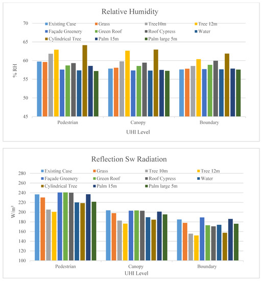 Generally, for the reference case and all scenarios, the air temperature decreased as it moved upward toward the boundary level for all greenery types. The variation in air temperature in the pedestrian level between all scenarios reaches 3.0 °C, while this variation significantly decreases in the canopy and boundary layers to reach 1.0 °C and 0.5 °C, respectively (Figure 6). In terms of the investigated microclimate indicators, air temperature, wind speed, relative humidity, and shortwave reflection, for all simulated greenery scenarios the air temperature of the boulevard decreased compared to the reference case at the three levels. However, this reduction varied according to the different types of greenery; the results showed that the 12 m and cylindrical trees with high LAD are the most effective types in reducing air temperature in both pedestrian and canopy levels. While the green roof affected more pedestrian and boundary levels, it does not show a notable impact on the canopy air temperature. This result could be related to the results section of the canopy layer as it represents the average height of the buildings. However, the roof greenery type plays an important role in reducing the other two layers’ air temperature, and for the denser and higher LAD type of roof, the ‘Ruellia’ greenery is more effective, especially in reducing the boundary layer temperature. It is important to mention that the local famous tree, the ‘Palm’ with the medium LAD, showed a good performance in reducing air temperature in the three layers. With respect to water, it mostly affects the pedestrian level due to the evaporative cooling process, while it has no notable impact on the canopy and boundary air temperatures. From this result, it could be predicted that using the water at the building’s roof would have a positive impact on reducing the air temperature within this layer. Furthermore, the results showed that the wind speed in the pedestrian and canopy layer dose not affected by the investigated greenery types. Opposite to that, some greenery types showed a significant impact on the wind velocity of the boundary layer.