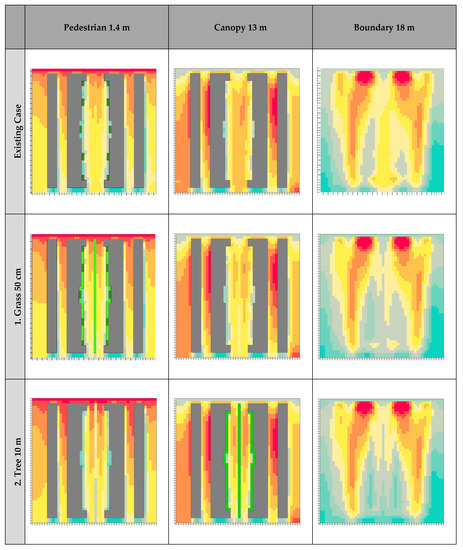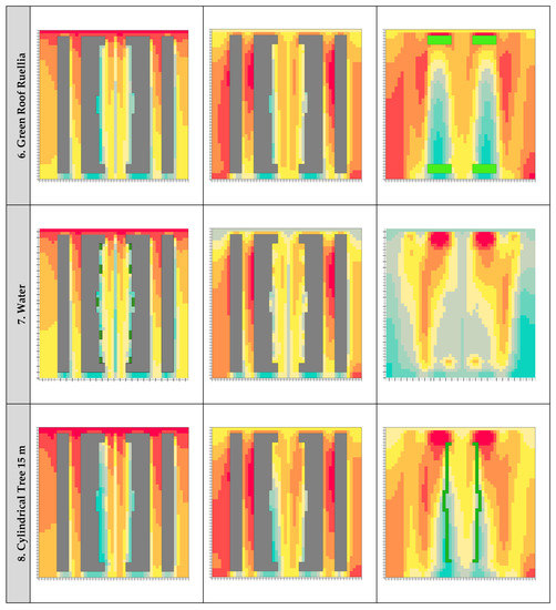 The results showed that all of the developed scenarios reduced air temperature in the boundary layer with a slight variation compared to the reference case. However, the most effective scenarios of greenery in reducing air temperature of this level were the green roofs, cylindrical trees, and palm trees, while the 50 cm green grass and water scenarios did not show any notable impact in reducing the temperature at this level. On the other hand, the same mentioned effective scenarios have a notable impact on the wind speed compared to the reference case at this level. The Ruellia green roof reduced the wind by 0.2 m/s, followed by the cylindrical trees and palms, which reduced wind speed by 0.3 m/s compared to the reference case. This reduction in wind speed is related to the obstacles created by the leaves of these greenery types. The impact of greenery on the relative humidity showed a clear variation in this level, however, this variation is less compared to the canopy and pedestrian levels. The 15 m cylindrical tree and the roof with Ruellia greenery recorded higher relative humidity compared to the reference case in this level, with values of 4.3%, 2.8%, and 2.3%, respectively. At this level, the greenery scenarios showed a different performance against the reflection of the shortwave radiation compared to the pedestrian and canopy levels. Most of the scenarios showed a positive impact on reducing the effect of the shortwave radiation by reducing the reflection; the most effective scenarios were the 10 m and 12 m trees, in addition to the 15 m cylindrical tree. Moreover, green roofs played a notable role in reducing the impact of the short wave in this level, by reducing the reflection 14.1 W/m2 compared to the reference case (Figure 5) (Appendix A).