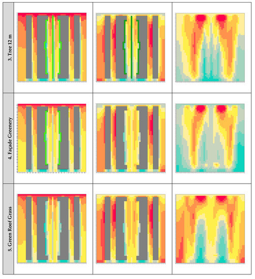 For the wind speed parameter, most of the vegetation scenarios showed similar performance in this level with a variation less than 0.1 m/s compared to the reference case. Only the scenario of the green roof with 50 cm vegetation recorded a slight increase in wind speed by 0.1 m/s compared to the reference case. On the other hand, the relative humidity of the proposed greenery scenarios at this level varied significantly; the results proved that the high and dense trees increase the relative humidity. The most effective type was the cylindrical tree with an increase of 12.33% compared to the reference case, followed by the 12 m and 10 m trees with an increase of 3.2% and 2.1%, respectively. The scenario of water recorded the lowest value, followed by the two palm scenarios that recorded a reduction in relative humidity of 2.6% and 1.2%, respectively, while the 50 cm green grass has no notable effect on relative humidity compared to the reference case at the pedestrian level. Furthermore, the simulation results in asses the short wave reflection of each scenario. In general, the reflection of the short wave has fluctuated significantly according to the greenery type at the pedestrian level. The most effective greenery type in absorbing the radiation was the 12 m and 10 m trees with a reduction in the reflected ratio by 36.07 W/m2 and 31.45 W/m2, respectively, compared to the reference case. The cylindrical tree and the water scenario showed an effective performance in reducing shortwave reflection by 17.94 W/m2 and 16.54 W/m2, respectively. On the other hand, the reference case showed a better performance in reducing the shortwave impact on the pedestrian level compared to the green roof and green façade. Whereas the palm tree 15 m showed a slight reduction of 0.21 W/m2, the large 5 m palm was more effective in reducing the impact of the shortwave with a reduction of 15.22 W/m2 compared to the reference case at pedestrian level, the 50 cm grass has also an acceptable performance by reducing the shortwave impact 6.48 W/m2 compared to the reference case (Figure 5) (Appendix A).