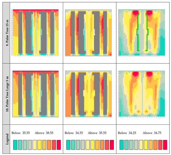 The strategy of developing the optimized scenario was based on using the most environmentally adapted types that could have a significant impact on reducing the outdoor air temperature without a notable increase in the relative humidity; this was achieved by integrating the high and medium LAD types. The palm trees were used for the median strip, and a small number of cylindrical trees were applied in the pedestrian pathway, in addition to adopting the benefit of the grass in the median strip and the pedestrian pathway next to the buildings. The green roof was used in the optimized proposal since it showed a significant impact on boundary layer air temperature, which will consequently have a positive impact on the total atmosphere.