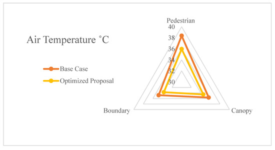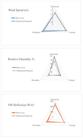 The results of the proposal have been evaluated against the reference case; the optimized proposal recorded an air temperature of 35.96 °C with a reduction of 2.41 °C compared to the reference case at pedestrian level. Further, the optimized proposal recorded a reduction in the shortwave reflection 16.73 W/m2 compared to the reference case and a slight reduction of 1.2% in the relative humidity at pedestrian level (Figure 7). However, the wind speed does not show any notable variation in the pedestrian and canopy level, while the wind speed in the boundary layer was the most affected parameter due to the impact of the cylindrical trees and the green roof: it recorded a reduction of 0.6 m/s compared to the reference case.