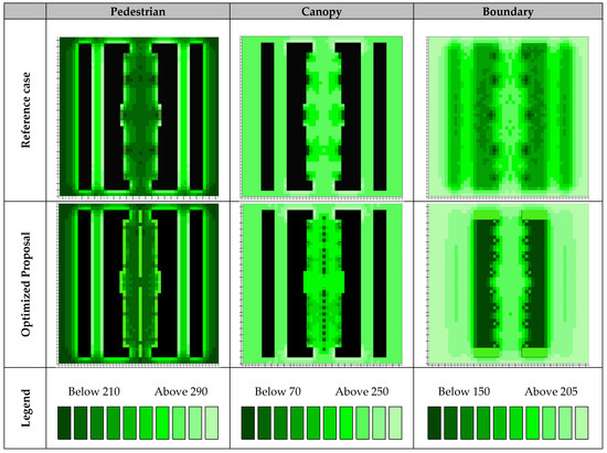 On the other hand, it has been observed that the distribution of the air temperature has varied from the reference case at the boundary layer, in spite of the slight reduction in total air temperature of this proposal compared to the reference case. This variation in air temperature distribution mainly related to the cylindrical trees and extensive roof greenery impact that trapped the temperature outside the planted areas. Moreover, it has been observed that in the canopy layer, the area surrounding the boulevard is more affected by the reduction in air temperature (Figure 8). The optimized proposal generally reduced the shortwave reflection of the three levels, however, it mostly affects the surrounded area due to the impact of the green roof and cylindrical trees (Figure 9).