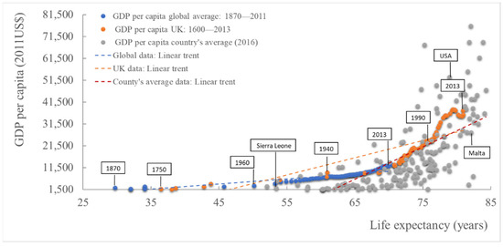 There is a general criticism about the human pursuit of wealth, which is attributed to their greediness. However, if we look at analytical data, we see that economic status is the quantified prosperity that increases the life expectancy of people, e.g., as seen for the Gross Domestic Product (GDP) of 172 countries (Figure 1), UK data (1600–2011) and the global average between 1870 and 2011, which is probably connected with the access to medical care. In this regard, Confucius famously said that “the first wealth is health” [4,5].