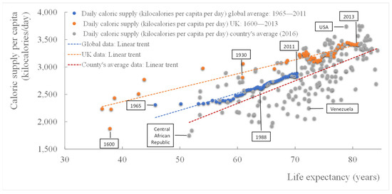The optimum caloric supply for humans is between 2000 and 2500 calories [10]. Data from 172 countries, UK (1600–2013) and global average show that even more consumption of the caloric supply is corelated to life expectancy and is an indicator of prosperity (Figure 2).