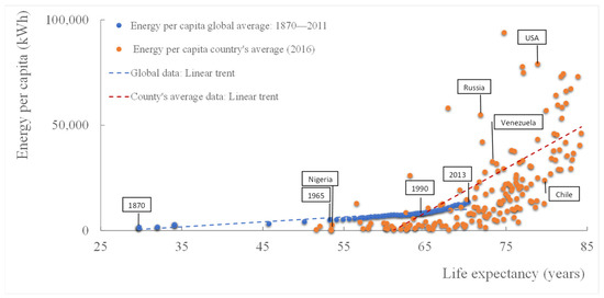 Life expectancy related to annual energy consumption per capita; global average (1965–2011) and 172 counties’ average data (2016) [6,18].