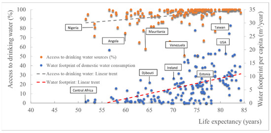 Life expectancy related to access to drinking water [21], and the annual water footprint of the consumption of domestic blue water per capita (1996–2005) [6,22,23].