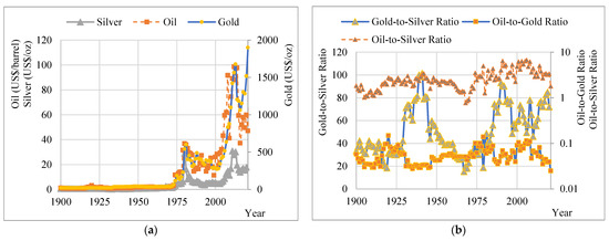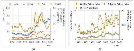 (a) Values of gold, silver, oil and wheat, (b) Gold to wheat ratio, silver to wheat ratio, oil to wheat ratio [29,30,46].