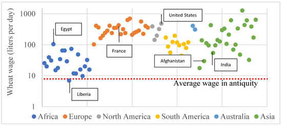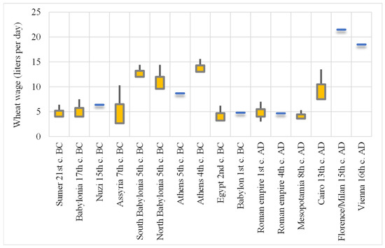 It is almost impossible to estimate the value of wealth based on the exchange rate of the currencies or the value of precious metals in historical eras. However, as wheat is the base element of the digestive menu of humans, and we have historical information of its cost and wages, we estimated the wheat wages (i.e., the liters of wheat that can be bought by a daily wage). Wheat wages is a proper measure, adapted already in antiquity by Solon for the differentiation of social classes of Athenians on the basis of the medimnoi (bushels) of grain produced [36]. This allows us to create an important cross-cultural comparison of economic wellbeing [37,38,39].