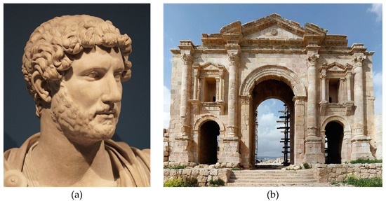 (a) Hadrian January 76–10 July 138 AD. (b) Arch of Hadrian in Jerash, Transjordan, built to honor Hadrian’s visit in 130 [62].