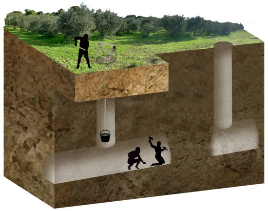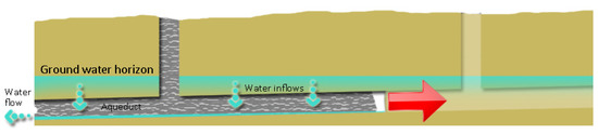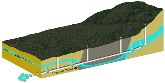 As the tunnel is under the groundwater level, the main volume of the carried water is collected by the aqueduct from an underground linear process called υδρομάστευση (groundwater capture) [68] (Figure 12). However, groundwater capture does not happen along all the length of the aqueduct but in areas with proper geological formation with a high-water level. It is also very impressive that the engineers in antiquity had to design an aqueduct without seeing the water. This can be explained by the note of Koutsoyiannis [69]: “Most principles related to water technology and management were known to ancient Greeks”.