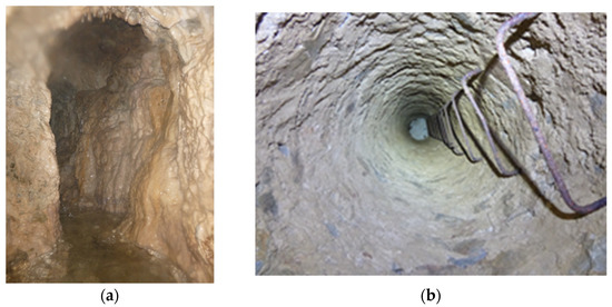 In order to approach and describe the construction of the aqueduct, in situ research [2], including underground explorations, are carried out from members of the “Urban Speleology Research Team” under the leadership of the second author, Panos Defteraios. The team was trained in the Training Programs of Hellenic Speleological Society (ESE) and followed all required security measures, methods and equipment (Figure 15, Figure 16 and Figures S1–S4).