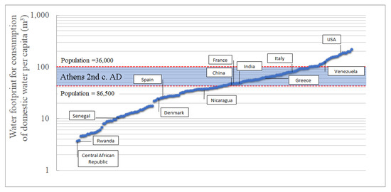 In Section 5, we also estimate the water footprint of an Athenian in the Roman era, and we correlate it with the water consumption of people in different countries. We found that about two billion peoples have access to less water than the Athenians of the Roman era.