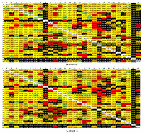 An overview of human efforts aiming to deal with problems related in semantic similarity jc for n = 1, …, 28 (Table 1): (a) for pandemic, there are 70.293 documents with ρ = 0.1438 and δ = 1 − ρ = 0.8562 (reliable), while, (b) for COVID-19, there are 171.299 documents with ρ = 0.1391 and δ = 1 − ρ = 0.8609 (reliable). Scopus database until 2021 (accessed on July 2022).