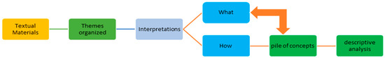 In this study, based on the textual material (docs and reports) and thematically organized, a formulating and reflective interpretation is provided for an overview and comparison of selected passages (with emphasis on metaphors/ concepts). In formulating the interpretation, the researcher stays at the level of immanent meaning, i.e., WHAT has been said [41,42,43,44] is reformulated. This step serves to alienate the material and differentiate the thematic content (into main and subthemes), exclude any contextual knowledge, and include specifics of the studied in the reformulation (e.g., “immigrant women” or “access” as an expression for the labor market). The subsequent reflective interpretation of the material is the core of the documentary method. Here it is important to break away from the WHAT level of the text and focus on and describe the HOW, i.e., How [42,44], for example, is the “access of immigrant women to the European labor market” a concrete topic or problem that is dealt with by a person or a group. Therefore, special attention is paid to performance aspects, such as the arrangement of the actual documents and the concepts extracted from the collected data or text types. In two steps, the material is first interpreted sequentially (i.e., step by step) and then subjected to descriptive analysis (Figure 5).