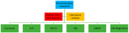 In the current study, the statistical research community incorporates various Literature and all documents and statistical reports published on the websites of EUROSTAT, ILO, OECD, UN, UNDP, and UN MIGRATION on labor market-related activities of migrants in Europe (Figure 6). The study refers to the period of the last two decades (2000–2022), during which the world has undergone significant changes both in the economic field and in the area of immigration.