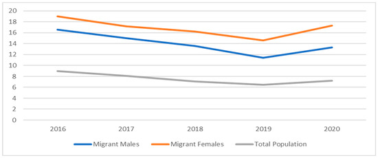 Unemployment rates (Figure 7) suggest that female third-country nationals still face many obstacles that may impede their overall integration. While unemployment rates for the overall population declined from an average of 9% in 2016 to nearly 7% in 2020 [6], third-country nationals as a whole lagged significantly, with average unemployment rates for female migrants remaining consistently higher than those for male migrants, and both experiencing more significant increases (+2%) between 2019 and 2020 than the overall population (less than 1%) [1,48].