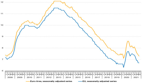 Unemployment rates, EU and EA (2008–2021) [6].
