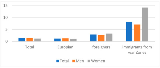 According to ILO data, the COVID effect in 2020 increased by 1.4 percentage points for all groups of people and by about 7 percentage points for people from countries at war and in crisis. Gender analysis also shows that foreigners, particularly female migrants or citizens from the eight main countries of origin of migrants (MENA), are significantly more affected by the crisis in terms of access to the labor market. Thus, the unemployment rate of female migrants in relation to their employment increased by a factor of 2 compared to male nationals from migrants’ countries of origin and by a factor of 14 compared to women with European nationality (Figure 11).