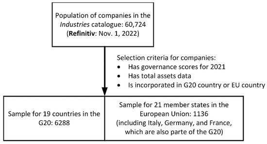 The first selection criterion was the availability of the Corporate Governance Score for the financial year 2021. The resulting sample had 8408 observations. The second selection criterion was for the country of incorporation (i.e., “country of domicile” in Refinitiv) to be part of the G20. Considering that the European Union is a member of the G20, companies from the 27 member states were considered eligible for analysis. The sample comprises 6288 observations for 19 countries in the G20 and 1136 observations for the European Union (but only companies in 21 member states had data collected by Refinitiv). These two subsets of data overlap for Germany, France, and Italy, which are members of the European Union and the G20. The sample is cross-sectional for the financial year 2021, as it reflects the latest version of the Refinitiv database (as of 1 October 2022). All companies included in the sample are very large corporations, listed on global stock exchanges. A summary of the sample selection procedure is presented in Figure 1.