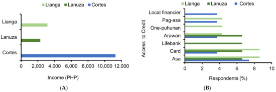 Monthly income of fishers in Lianga, Lanuza and Cortes (A) and access to credit of small-scale fishers (B) in the three municipalities of Surigao del Sur.