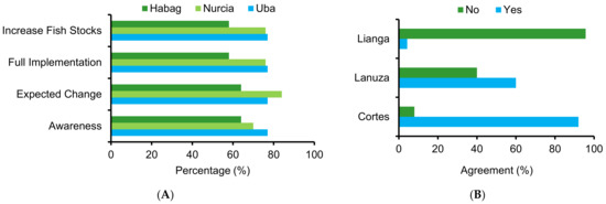 A typical action regarding implementing three-month regulations for ordinances, such as the closed season policy, require that the head of the fisherfolk organization are informed ahead of time. They are notified for the conduct of a meeting to disseminate the guidelines and rules to the fishers. (These guidelines are usually ordinances crafted either at the barangay level or municipal level that provide protection to fish species, or the marine ecosystem based on the best scientific evidence available stating its urgent protection or solution to a pressing problem). This was to help them prepare economically and emotionally regarding the closed season. For instance, in Cortez, barangay Uba had a 77% awareness and knowledge about the closed season compared to Nurcia (70%) and Habag (64%) in Lanuza. In terms of expected differences regarding the catch after implementation, barangay Uba had 77% who supported the implementation of the closed season, while barangay Nurcia had 84%, followed by Habag at 64%. Furthermore, in barangay Uba, about 77% claimed that the closed season would be useful and agreed to its full implementation. On the other hand, in barangay Nurcia, 76% of its respondents agreed to a closed season, and barangay Habag with 58%. The result of the initial survey data also revealed that the respondents of Uba (77%) declared that there will be an increase in fish stocks with the implementation of the closed season policy, followed by Nurcia (76%) and Habag (58%) (Figure 3A).