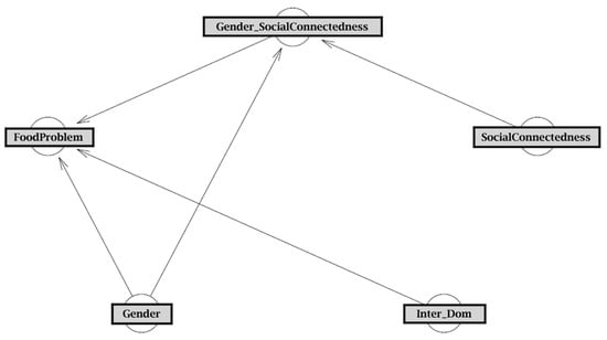 To test the hypothesis, we examined the model as presented in the Model Construction subsection. The model examined the effects of students’ gender and its interaction with social connectedness, and the type of student (international or domestic student) on the perceived difficulty of adjusting to new food. The model’s logical network is shown in Figure 1.