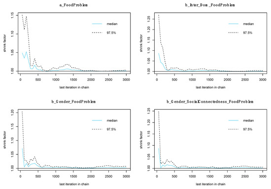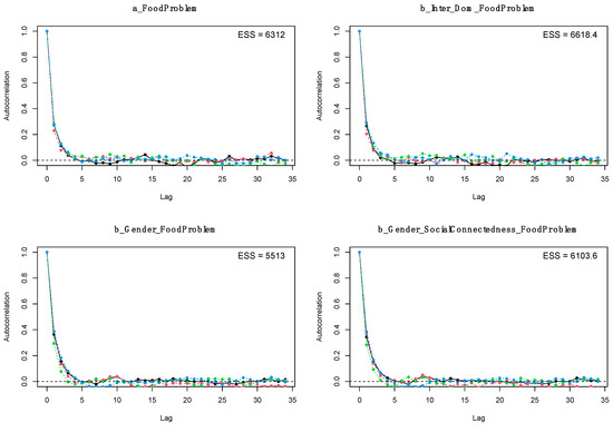 All parameters show a good convergence since the effective sample sizes (n_eff) are greater than 1000, and Gelman shrink factors (Rhat) all equal one (see Table 2). Furthermore, the convergence was also confirmed visually using trace plots, Gelman plots, and autocorrelation plots (see Figure 3, Figure 4 and Figure 5).