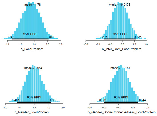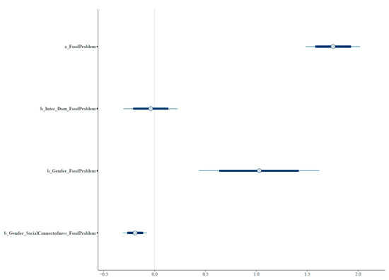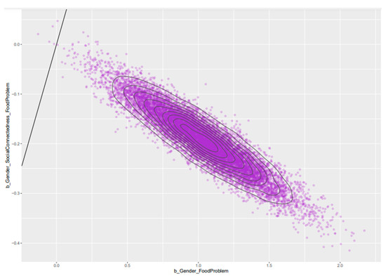 Regarding gender, females were found to be positively associated with a higher level of perceived difficulties in adjusting to new food ( = 1.03 and = 0.30). However, the interaction with social connectedness produced a negative value, suggesting social connectedness lessens the effect of gender on food problems ( = −0.19 and = 0.06). The impact of the type of student (domestic or international student) was found to be not significant toward food acculturative problems ( = −0.04 and = 0.13). The posterior distributions of Gender and Gender_SocialConnectedness fell entirely on the positive and negative, respectively, indicating the high reliability of the results (see Figure 6). We can also see that the majority of simulated samples are located on the positive side for Gender (x-axis) and the negative side for Gender_SocialConnectedness (y-axis) in the pairwise distribution graph (see Figure 7). We can also confirm the result’s reliability through the demonstration of the 95% highest posterior density intervals (HPDIs), as shown in Figure 8.