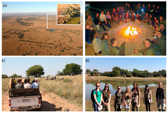 Between mid-2017 and the end of 2018, the reserve hosted 12 residential groups. Of these, eight were formal education trips and four were special interest trips. All trips were 8–12 days in duration and were fully immersive, with groups living, working, and socialising in the African bush (Figure 1b). Whilst the content of trips did vary to some extent, they all focused on real-world contentious issues, such as management of fenced animals, rhino poaching risk driven by global demand for horn, local anti-poaching measures, and trophy hunting. Moreover, many field activities were common to all trips, including participating in game drives (Figure 1c), undertaking walked mammal surveys (Figure 1d), using camera traps to survey elusive species, and undertaking vegetation assessments. Data collected related directly to reserve management or ongoing research studies [43,44,45,46]. In addition to the subject content of the trips, groups experienced day-to-day life on the reserve, including undertaking controlled burns for habitat management, being involved in species translocations, and assisting with rhino dehorning to reduce poaching risk.