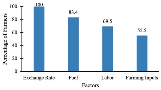 Each of the 36 farmers were asked an open-ended question about what factors most affected their farming net-profits. There were four factors identified by the farmers, as shown in Figure 1. Notably, all 36 farmers mentioned the exchange rate as a key factor. Poor access to affordable fuel was also mentioned as a reason they did not use fuel-powered equipment; indicating that efforts to increase farm mechanization also need to address fuel access. Additionally, due to the high manual labor needed to farm without machinery, many traditional farmers hire extra laborers. Often, as reported by 25 of our 36 farmers (69.5%), they cannot find enough laborers to hire, or the laborers are too expensive. As a result, farmers reported not being able to harvest their entire crops on time, causing them to lose part of their crops. Farmers (20 out of 36 or 55.5%) claimed they often have limited-to-no access to farming inputs (e.g., high-quality seeds, fertilizers, pesticides, straw removers) or they are too expensive to buy. As a result, they switch to local alternatives that are less efficient and lead to less output (and profits). For example, many of our farmers reported not being able to afford manufactured fertilizers, so they burn their land to create carbon that fertilizes their land, which is less efficient compared to manufactured fertilizers.