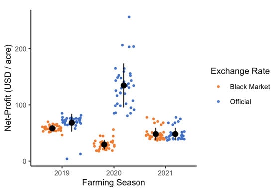 The 30 participants in the control group provided costs and revenues over the last three farming seasons (2019–2021), which were used to compute net-profit, as shown in Table 5. The cost of farming increased as the black-market exchange rate increased. However, the revenue did not necessarily follow this pattern, causing fluctuations in net-profit.