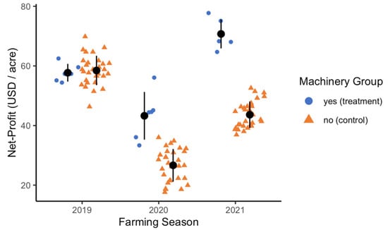 An ANOVA was performed to compare the effects of the interaction of farming season and machinery group on the net-profits, in USD per acre. There was a significant effect of year [F(2, 102) = 289.86, p < 0.001], machinery group [F(1, 102) = 119.11, p < 0.001] and year by machinery group [F(2, 102) = 38.32, p < 0.001] on net-profit. A Tukey HSD post hoc test indicated a statistically significant difference (p < 0.01) between all pairwise comparisons of the group by year except for two: (1) 2019 control vs. 2019 treatment (p = 0.999), which indicates similarity when both groups were farming without machinery; and (2) 2020 treatment vs. 2021 control, which speaks to the volatility in the value of the SDG. More specifically, the use of machinery was associated with a 62.30% increase in net-profit for the 2020 season (USD 26.66/acre vs. USD 43.27/acre) and a 62.01% increase in net-profit for the 2021 season (USD 43.64/acre vs. USD 70.74/acre).