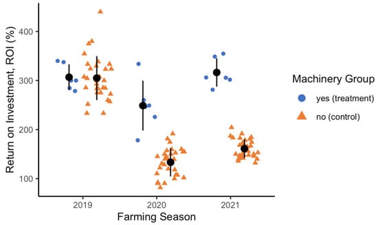 Similar to the net-profit analysis, a comparison of the 2019, 2020, and 2021 ROIs for the treatment and control group farmers is provided in Figure 4. As before, relatively higher values are expected in 2019 due to the exchange rate. However, within each year there are significant differences between the groups, representing the effect of machinery.