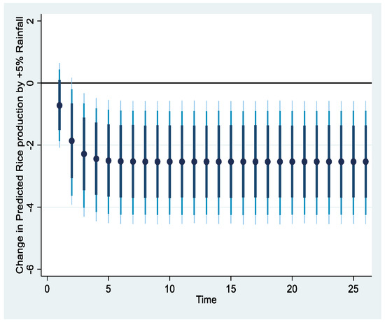 The impact of 5% increase (decrease) in rainfall on rice production (impulse response).