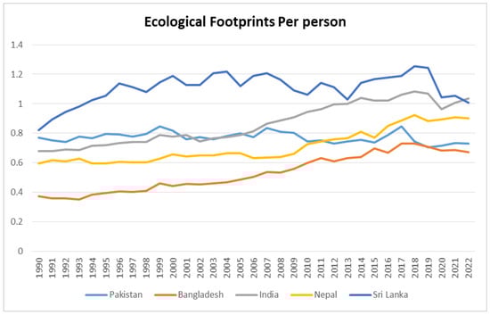 For centuries, mankind has been bounded by the environment, with their activities like fishing, industry, international trade, and, most importantly agriculture significantly affecting the sea and land. There are conflicting ideologies to address these issues []. By not catering to the environmental quality of the country, financial expansion is a major hindrance to income sets and population expansion. The anthropological environmental footprints give us a detailed view of how anthropogenic activities have a communal impact, of how to calculate it using the area of bio-productive land, of the water needed to produce the goods consumed, and of the resulting waste generated. To be precise, it is the effect on the environment due to the anthropogenic activities required for our living []. The ecological footprint describes how anthropogenic activities are affecting the territory []. As per the recent literature, the ecological footprint points toward ecological deprivation [,,,,]. It gives us a detailed view of how the fabrication and depletion of human sources affect ecology []. In developing countries like Pakistan, ecological expansion is a major publicized and conventional concern. Many corporations and private organizations in Pakistan do not take seriously how their sources are affecting the ecology and how harmful and dangerous their effects are. Biodiversity is decreasing rapidly due to the increasing population, and the per-capita consumption has increased the ecological footprint of Pakistan. It is an alarming situation for human beings and their habitats that are losing biodiversity, which is causing a growth in ecological footprint. To sustain the ecological footprint, we need to produce a good amount of natural resources. According to an estimation, it will take 1.5 Earths to produce the required number of natural resources. Global climate change, ecological deprivation, hunting and fishing, and loss of habitat are the major concerns that are affecting biodiversity. South Asia is dealing with a major environmental discrepancy, which means it preserves less and consumes more []. Biocapacity and population are related to the economy and its ecological footprint [,]. It would be helpful to know what the major factors are that are affecting the ecological footprint in Asian countries. These countries have signed the Kyoto agreement with the United Nations and, as per the agreement, it must reduce its pollution to the required levels. A large population is exerting pressure on the land, which means that forests and agricultural land are being urbanized for the sake of living, causing major deforestation in the last two decades [,]. Figure 1 shows the trend of EF in South Asian nations.
