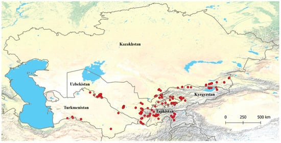 Research was carried out in Kazakhstan, Kyrgyzstan, Tajikistan, Turkmenistan, and Uzbekistan via the collaboration of national research and education institutes with local community-based agencies and farmer communities. Economic development ranged from less-developed (lower middle income) economies in Kyrgyzstan, Tajikistan, and Uzbekistan, to the more-developed (upper middle income) economies such as Kazakhstan and Turkmenistan, which are oil-based (World Bank Country and Lending Groups webpage (https://datahelpdesk.worldbank.org/knowledgebase/articles/906519, accessed on 11 September 2023). Seventeen social economic zones were selected to encompass environmental, cultural, technological, and economic differences (see Tables S1 and S2 in Supplementary Materials for details). Figure 1 presents the locations of the sampled households across the five studied countries.