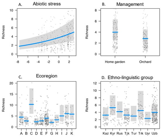 According to the estimated values for fixed factors (Table 2, Figure 3), we found that diversity increases significantly with the increase in abiotic stress; the trend is clear, and confidence intervals (CI) are narrow around the coefficient estimate. Figure 3A shows this trend clearly. Among management practices, home gardens harbor a significantly higher diversity with respect to orchards. The coefficient estimate for the management factor, despite a wide CI, shows that varieties under orchard management have clearly less varietal diversity compared to home gardens; Figure 3B gives a good visualization of the differences between the two management types. Among the ecoregions, as represented in Figure 3C, we found large fluctuations in the estimated diversity in many cases, such as the Central Asian northern desert (C), Pamir alpine desert and tundra (I), Tian Shan foothill arid steppe (J), and the Tian Shan montane conifer forests (K), which showed higher estimated values of richness whereas Badghyz and Karabil semi-desert (B), Central Asian riparian woodlands (D), Central Asian southern desert (E), and Kopet Dag semi-desert (G) showed a low diversity. Among the different ethno-linguistic groups (Figure 3D), we found significant differences, especially in the Kyrgyz, Russian, Turkmen, and Uzbek groups, which are related to a higher tree diversity. However, it is difficult to evaluate the effect of this variable due to the general wide confidence interval. Graphs in Figure 3 provide a good visualization of correlations and confidence intervals.