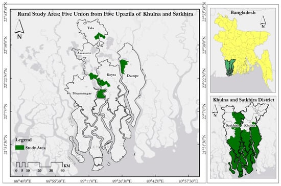 The indicated districts offer a setting where the interplay between vulnerable rural communities and the negative consequences of climate change is intricate. Additionally, the metropolitan areas in these districts, which see a significant influx of climate migrants, provide an ideal context for this study. The study focused on two unions in Khulna district, Sutrakhali union in Dacope upazila and Koyra union in Koyra upazila, as well as three unions in Satkhira district: Pratapnagar union in Assasuni upazila, Gabura union in Shyamnagar upazila, and Jalalpur union in Tala upazila, in order to examine rural populations (see rural locations in Figure 2). These places are located in the most vulnerable zone to severe climate events.